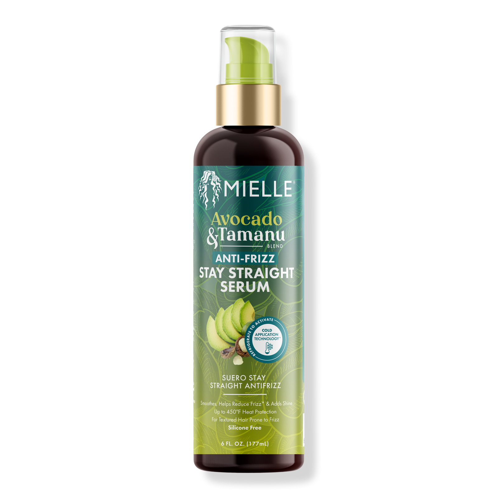 Mielle Avocado & Tamanu Anti-Frizz Stay Straight Serum. Put frizz, humidity and reversion on ice! Best served cold, Mielle's anti-frizz serum uses Cold Application Technology to seal hair and provide up to 450 degrees of heat protection. The result? Softer, shinier, longer lasting straight styles.